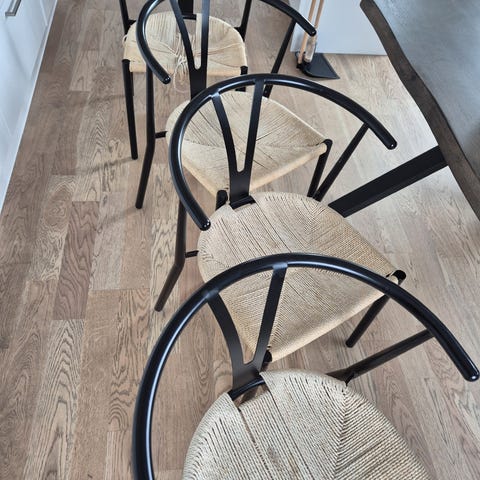 8st matstolar från Sleepo i modellen ’Evert’ i svart/natur. Köpta nya av oss hösten 2021. Finns små avskav på vissa av stolarna, men inget man direkt tänker på om man inte kollar noga.