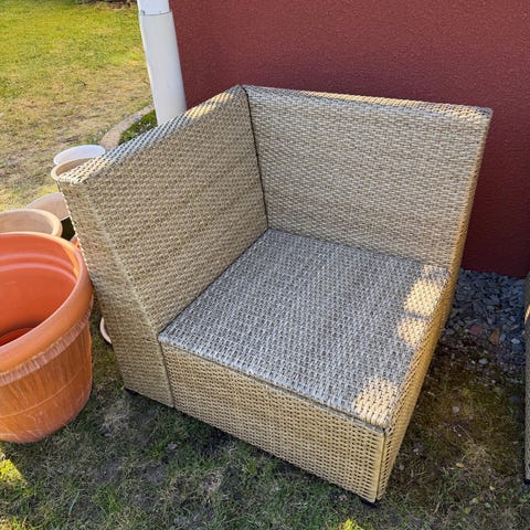 2 st Hörnmoduler, 6 st mittmoduler och 2 st låga bord till utemöbelgrupp i svart konstrotting. Delarna består av en hörnsektion med rygg- och sidostöd, en mittsektion med ryggstöd samt ett kvadratiskt bord. Möblerna är anpassade för utomhusbruk, exempelvis på altan, balkong eller uteplats. Sits- och bordsyta är flätade i konstrotting och benen är integrerade i stommen. Dynor ingår inte på bilderna och kan behöva kompletteras separat.