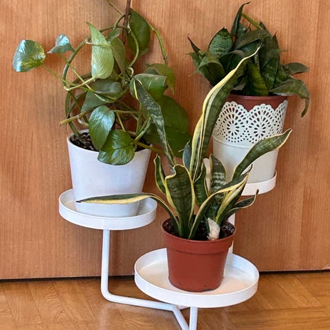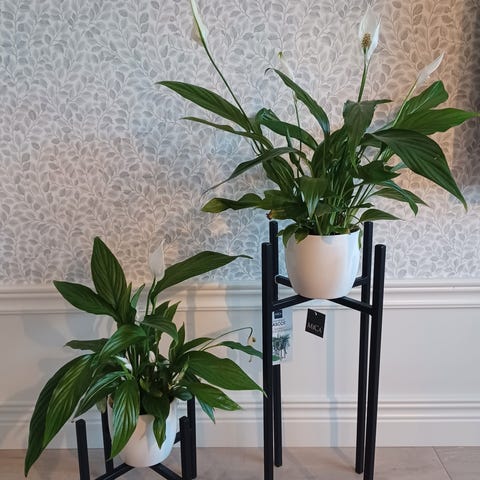 Blomsterställ i metall i ett set om två. Båda ställen är i beige färg med gallerformad korg och tre ben. De lämpar sig för krukväxter inomhus och kan placeras exempelvis vid fönster eller längs en vägg. Ställen ger växterna upphöjd placering och underlättar städning under.