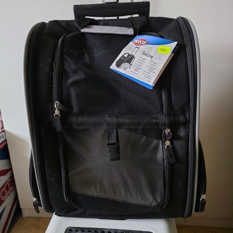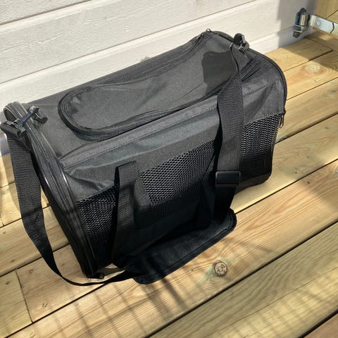 Ryggsäck transportväska för katt och liten hund med transparent kupol framtill. Väskan har hård, genomskinlig frontpanel med rund observationskupol och flera ventilationshål. Sidorna har nätpaneler för extra luftflöde. Justerbara axelremmar och bärhandtag upptill. Mått cirka 45 cm hög och 35 cm bred enligt bild. Lämplig för transport av mindre husdjur vid promenader och resor. Finns i Bara.