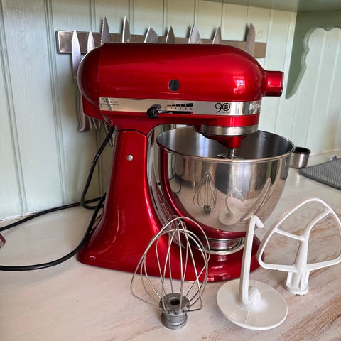 KitchenAid Artisan köksmaskin i rosa med rostfri bunke. Köksmaskinen har en skål i rostfritt stål och levereras med tillbehör som degkrok och flatblandare enligt bild. Passar för blandning, vispning och knådning av olika typer av degar och smeter i hushållet.