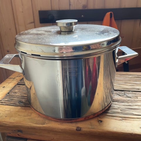 En stor gryta (6 l) av mycket god kvalité som värmer väldigt jämnt tack vare kopparbotten. Säljer enbart för att vi flyttar till boende med induktionsspis. Den klarar diskmaskin fint och kommer troligen aldrig att slitas ut.