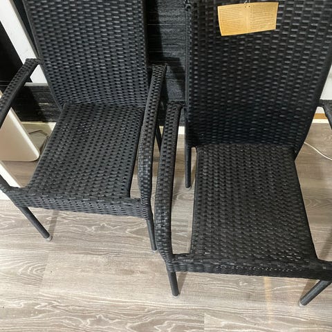 Stapelbara trädgårdsstolar i metall i silverfärg b59 d59 h70 4 st. Stolarna har rundad rygg och sits med ribbor. De är utformade för utomhusbruk på altan, balkong eller i trädgård och kan staplas för enkel förvaring när de inte används. Pris 400 kr. för alla.