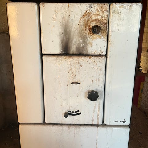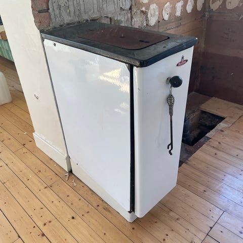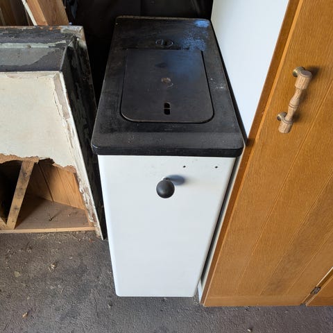 Vedspis i vit färg med två luckor framtill. Utrustad med reglage och ventiler på fronten. Passar för uppvärmning och matlagning i kök eller annan inomhusmiljö där vedeldning är möjlig och tillåten.