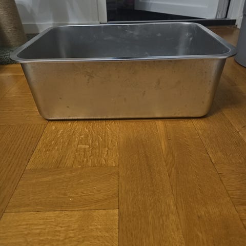 Kattlåda med två metalltalrikar.
