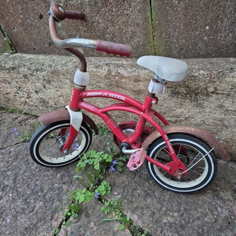 Bergamont barncykel med 10" hjul. Cykeln är avsedd för mindre barn och har tre hjul för stabilitet. Sadel och styre är anpassade för barnstorlek. Lämplig för kortare turer och lek på gård eller liknande ytor.