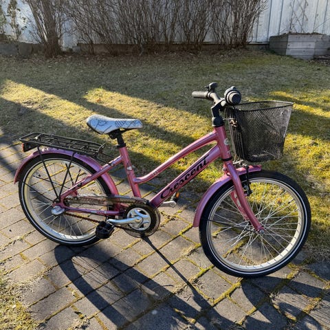 Crescent Saga barncykel 3-växlad med 20" hjul i rosa färg. Utrustad med pakethållare bak, korg fram, stöd och reflexer. Lämplig som cykel för barn i den storlek som passar 20-tums hjul. Allt funkar bra och den har mycket kvar att ge.