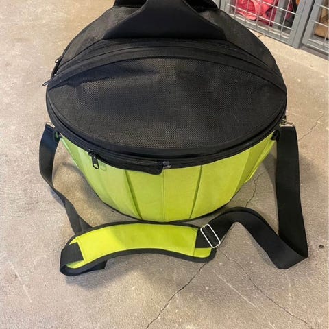 Bendson transportväska för hund eller katt i svart textil med nätpaneler på flera sidor för ventilation och insyn. Väskan har bärhandtag upptill och på sidan, samt dragkedjeöppningar för enkel åtkomst. På ena sidan finns en ytterficka med dragkedja för förvaring av tillbehör. Väskan är hopfällbar och har förstärkt botten för stabilitet. Lämplig för mindre hundar eller katter vid bilresor eller kortare transporter. Mindre slitage syns på en tygflik vid dragkedjan enligt bild.