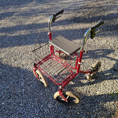 Hopfällbar knäskoter med korg i svart färg. Knäskotern har fyra hjul, justerbart styre och justerbart knästöd för användare i olika längder. Utrustad med dubbelt bromssystem på styret för kontrollerad inbromsning och parkering. Framtill finns en avtagbar korg för transport av mindre saker. Avsedd för personer som behöver avlasta ett ben (tex fotskador )eller en fot vid förflyttning inomhus och utomhus på jämna underlag.