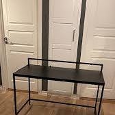 Ett Fint lite mindre skrivbord med stol o Lampa . Det är pålimmat plast som ser ut som stenskiva snyggt gjort . Mått 90x60 o 73 högt .