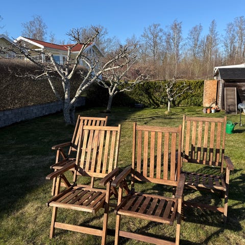 TEAK Solstolar trädgårdsstolar med fotstöd i trä. Stolarna har ribbad sits och rygg samt integrerat fotstöd som kan fällas ut för bekvämare viloläge. Passar för uteplats, altan eller trädgård. Träkonstruktionen är väderpåverkad och kan vid behov slipas och oljas eller målas om efter önskemål. 1 stor 1 liten för barn. Stått ute i två år.