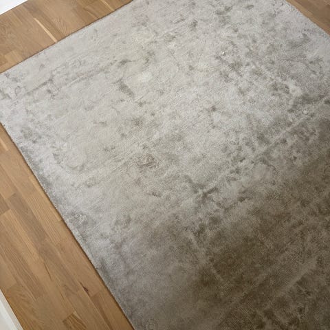 Mattan är varsamt använd i en gästlägenhet, men har legat hopvikt ett tag. Därför syns vikmärken, som slätar ut sig när mattan ligger utlagd på golvet.