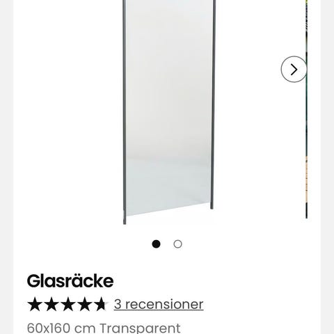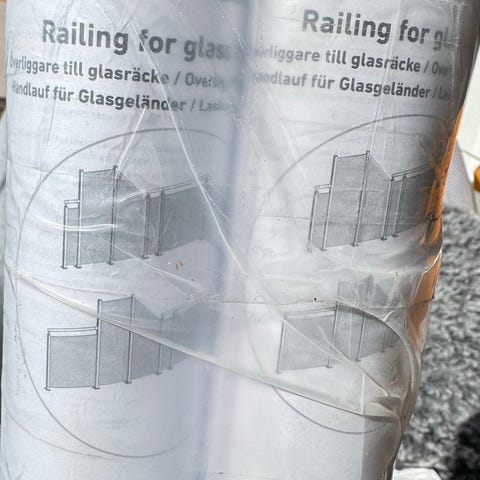 Glasräcke i flera sektioner av klart glas med metallbeslag för montering. Glaset är rektangulärt och är av av kraftigare typ med •safety glass stämpel• lämpligt som räcke eller vindskydd på altan, balkong, planteringslåda eller liknande utomhusmiljö. Beslagen är genomgående fästen i metall som sitter monterade i glaset för infästning mot underlag, låda eller stolpar.