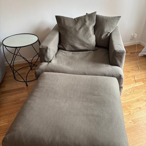En riktigt bekväm fåtölj inkl rejäl fotpall 500kr