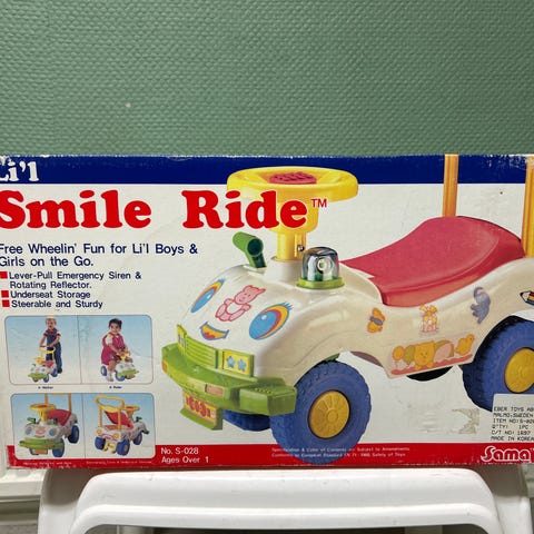 Färgglad leksaksbil som barn kan köra. Den låter när man åker med den fram och tillbaka. Bollarna åker liksom upp och ner. Vi har fått den som gåva, men inte använt