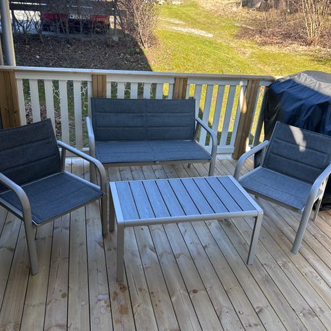 Utemöbler, soffa, 2 fåtöljer och bord i grå konstrotting