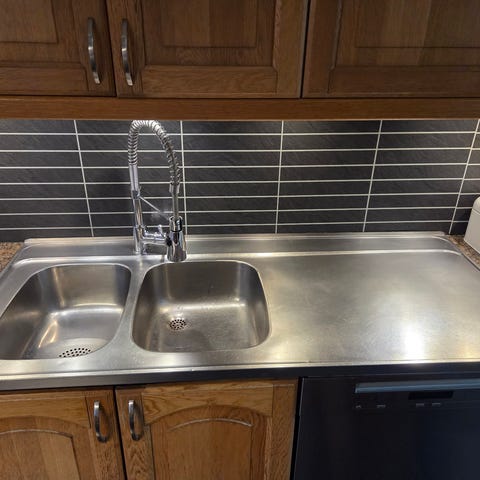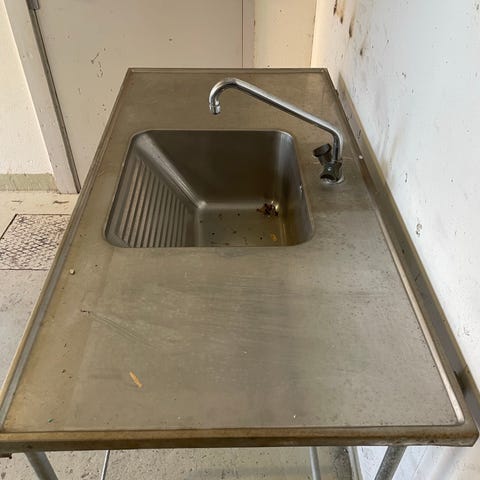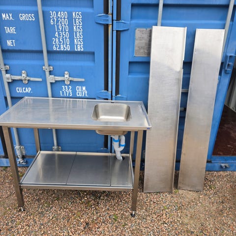 Rostfri diskbänk med integrerad ho och blandare. Bänken är utförd i rostfritt stål med uppvikt bakkant mot vägg. Diskhon är placerad på ena sidan av bänken och har avlopp med sil. Underredet består av benställning i metall. Passar för kök eller serveringsmiljö där en tålig och lättstädad arbets- och diskbänk behövs.