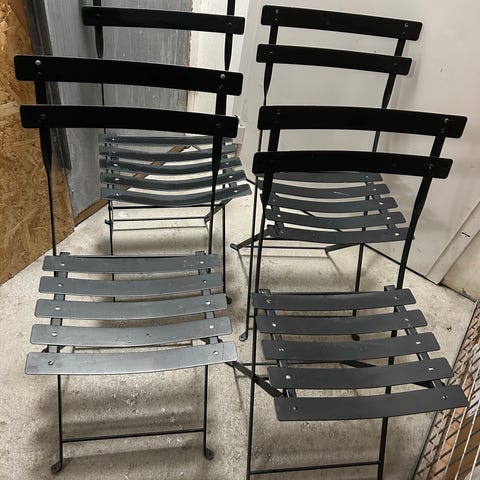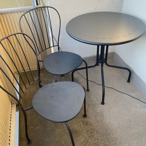 Hopfällbart caféset bestående av ett runt/ovalformat bord och två stolar i svart färg. Bord och stolar har metallstativ och sits/ bordsskiva i slätt material som är lätt att torka av. Stolarna är hopfällbara med handtag i ryggstödet för enkel förflyttning och förvaring. Passar exempelvis i mindre kök, på balkong eller som extra sittplatser vid behov.