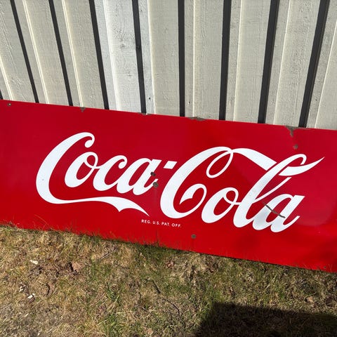 Pommac reklamskylt från -60 talet i metall. Skylten har texten "Drick Pommac uppfriskande" och är avsedd som vägg- eller utomhusskylt. Skylten är ca 1,8m bred och 1,2m hög. Har legat i förråd och aldrig uppsatt, dock finns mindre repor.