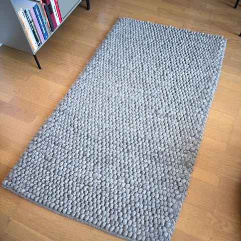 Hay Peas matta i storlek 140x200 cm. Mattan är tillverkad i ull och har en ljusgrå färg med karakteristisk småknottrig struktur. Passar exempelvis i vardagsrum, sovrum eller under ett soffbord där en mjuk och texturerad matta önskas.