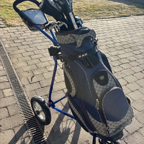 3 st golfset stora settet höger klubbor komplett med skor, dam set komplett med skor, vänster klubbor. Barn korg och klubbor. Två hopfällbara vagnar ingår. Allt säljs för 1500kr