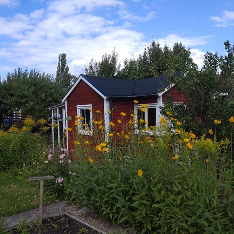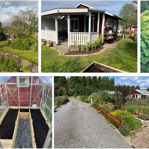 Tomten är rik på buskar och perenna växter, vilket ger en grön och ombonad miljö, samtidigt som det finns gott om utrymme för egna odlingar.