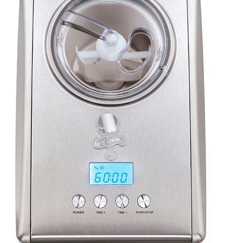 Wilfa glassmaskin för att göra egen glass. Jag fick maskinen som födelsedagspresent år 2020 som tack för hjälp. Den har bara provats två eller tre gånger, men trots att den funkar alldeles utmärkt har den blivit stående i ett hörn. Maskinen har en inbyggd kompressor och en löstagbar skål. Den har en digital display och knappar för att justera tid och start/stopp.