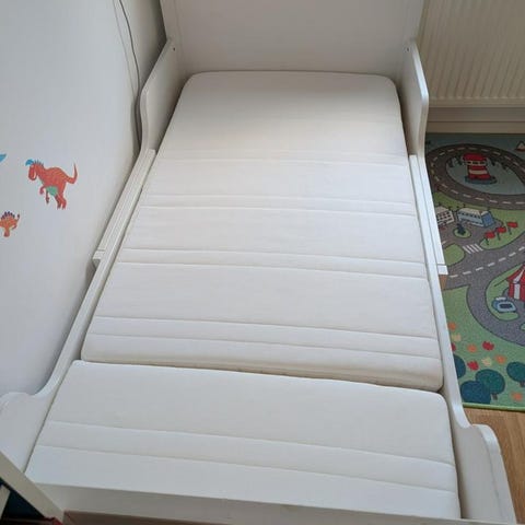 Utdragbar barnsäng i vit färg. Sängen består av en huvuddel och en utdragbar del som ger extra sovplats. Ram i trä med ribbotten. Madrasser ingår.