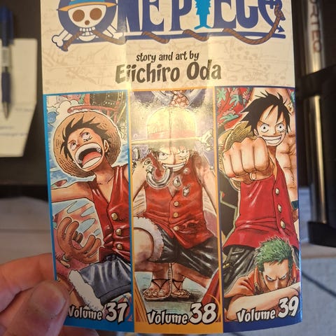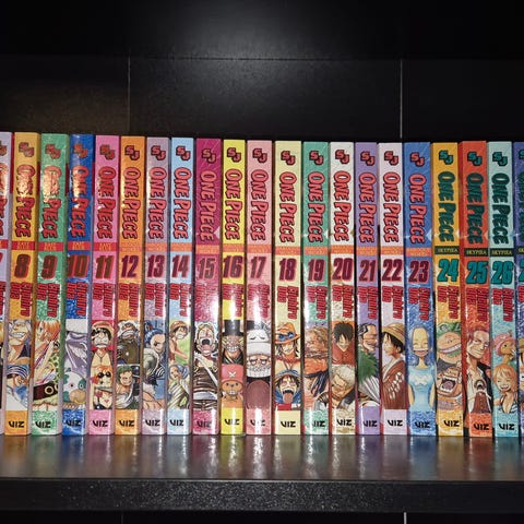 One Piece manga samling. Flera volymer av mangaserien One Piece på engelska Pocketformat med tryckt färgframsida och svartvit insida. Lämplig för läsare som samlar på eller läser manga på originalspråk.