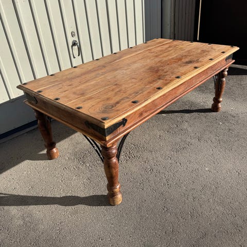 Soffbord i masdiv trä med rektangulär bordsskiva i naturfärg. Bordet har kraftiga, profilerade ben och en skiva uppbyggd av träplank med synlig ådring och dekorativa träinfällningar. Passar som soffbord i vardagsrum eller allrum.
