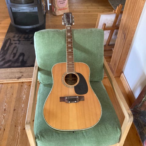 Akustisk gitarr i naturfärgat trä. Gitarren har sex strängar och klassisk kropp med runt ljudhål. Passar för akustiskt spel i hemmet eller vid övning och enklare framträdanden.