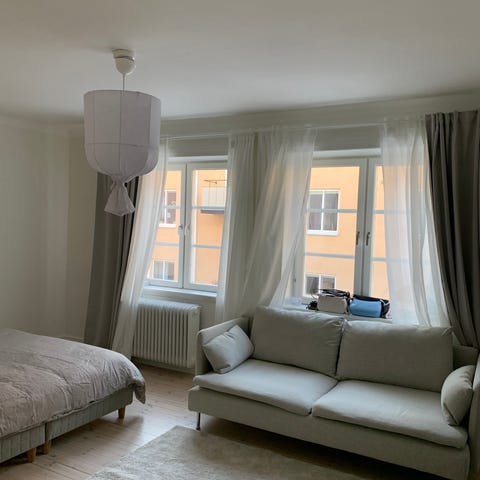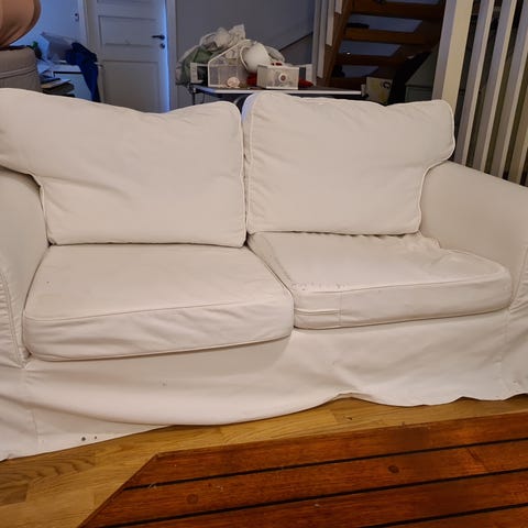 IKEA soffa 3-sits i vit tygklädsel. Soffan har tre sittdynor och tre ryggkuddar samt rundade armstöd. Avtagbar klädsel på dynor och kuddar. Passar som sittmöbel i vardagsrum eller liknande utrymme. (Ett litet hörn nere till vänster behöver en liten söm reparation (sömnad) eller ett nytt överdrag från IKEA. Överdragen kan tvättas i maskin, kuddar och stomme i gott och stabilt skick. Inga husdjur eller rökning har förekommit på soffan. (Mycket ren och fräsch.)