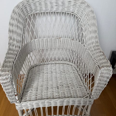 Två lika korgstolar vintage.Original vita. Något sliten men kan repareras med lite färg. Se bilder.