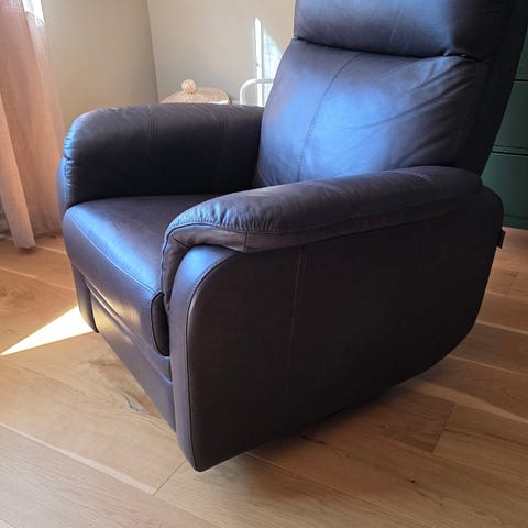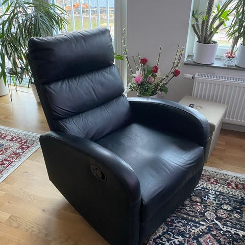 Grå skinnfåtölj med recliner. Några mörkare partier förekommer se bilder