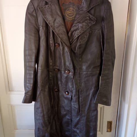 Mått: L 197 cm Arm 60 cm Dubbelknäppt med skärp. Sällsynt fynd.