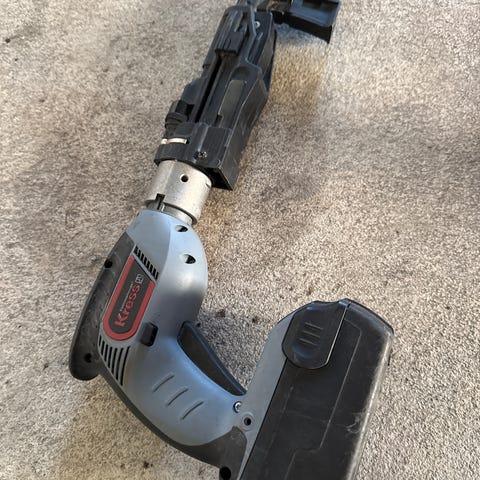 Panasonic fogpistol med modellnummer EY3640. Laddare modell EY0L81. Tre stycken 14.4V Li-ion batterier medföljer, två på 3.1Ah och ett på 4.2Ah.