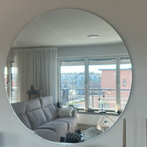 IKEA Lindbyn stor spegel (110 cm) med tunn, diskret, vit ram.