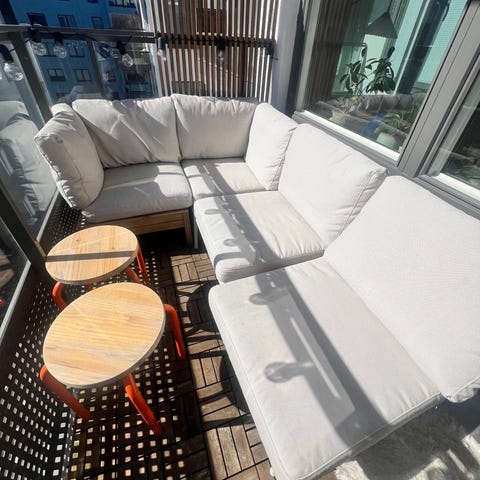 Utemöbeln Äpplarö från IKEA med dynor samt tillhörande soffbord i trä. Modulerna går att är strukturera om så att det kan passa in i olika utrymmen.