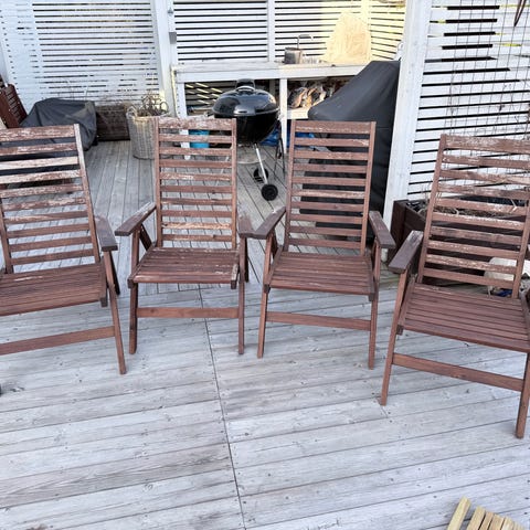Soffbordet matchar soffans trästomme. Passar som sittgrupp på uteplatsen eller liknande utrymme.