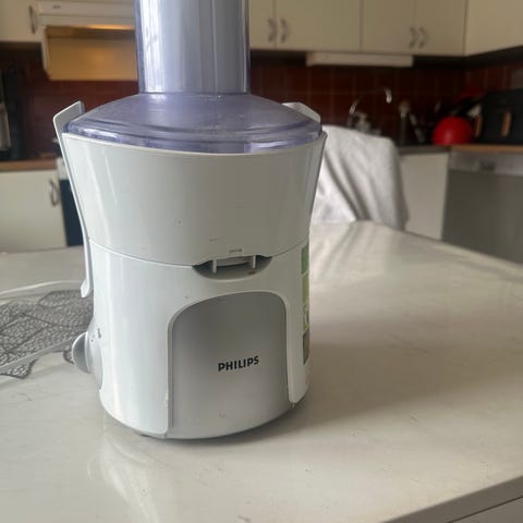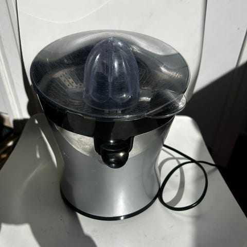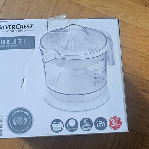 Coline citruspress i vit plast med genomskinlig behållare. Utrustad med hällpip och handtag för enkel upphällning av juice. Drivs med el och har nätkabel med stickkontakt för användning i vanligt vägguttag. Avsedd för pressning av citrusfrukter som apelsin, citron och grapefrukt i hushållet.
