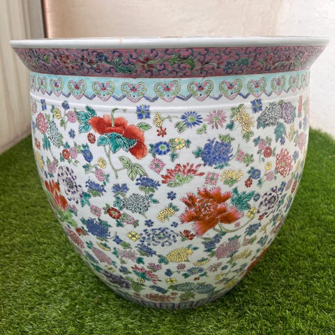 Blomsterställning pidestal i keramik i vit färg med rosa blommotiv. Höjd 55,5 cm. Passar både inomhus eller exempelvis på altan, balkong eller i trädgård under tak.