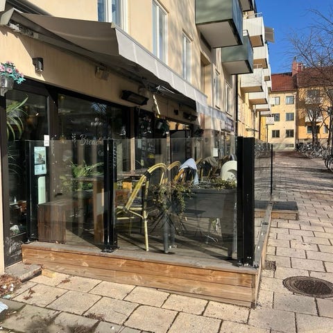 Glasräcke för altan med stolpar och metallfästen. Räcket består av glaspartier monterade mellan vertikala stolpar längs trädäck. Glaset hålls på plats med metallbeslag som skruvas fast i stolparna. Passar som vindskydd eller avgränsning runt altan eller uteplats.
