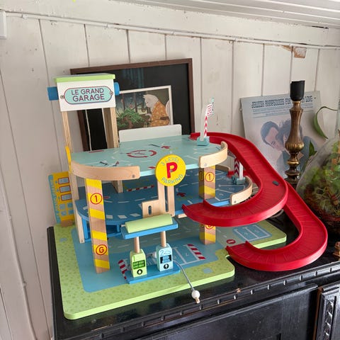Top Model parkeringshus leksak i trä i vit färg med svarta detaljer. Parkeringshuset har flera våningar med ramper, markerade parkeringsrutor och helikopterplatta på taket. Passar för lek med små bilar och andra fordon. Byggt i stabilt trä med tryckta vägmarkeringar på planen.