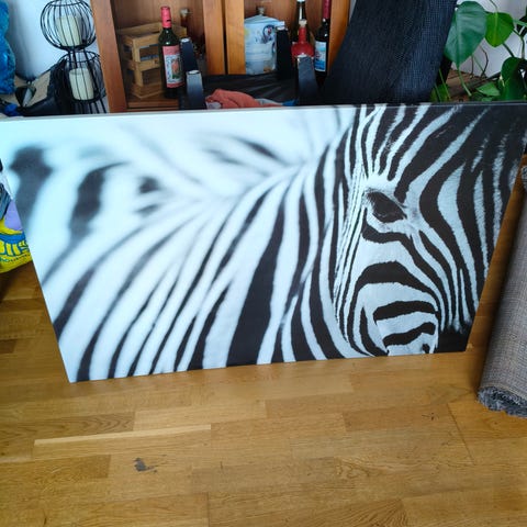 Mio tavla med blommotiv och IKEA tavla med zebramotiv. Ena tavlan föreställer en närbild av en zebra i svartvitt och den andra tavlan har ett abstrakt blommotiv i ljusa och mörka toner. Passar som väggdekoration i exempelvis vardagsrum, sovrum eller hall. Material och exakta mått är inte angivna. 200 kr st eller 350 kr tillsammans