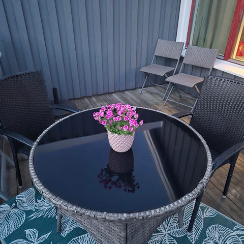 Utemöbler bestående av cafébord och stolar i svart metall. cirka 40 stolar och cirka 12st.bord Passar för uteservering, altan eller trädgård. Bord och stolar är stapelbara och anpassade för utomhusbruk på exempelvis sten- eller betongunderlag.