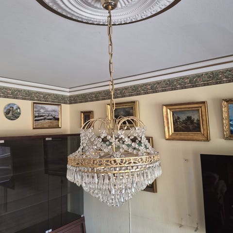 En fin kristallkrona som har många slipade prismor den är 60 x 45 cm utan kedjan och har 5 ijuslampor runtom samt 2 i mitten.