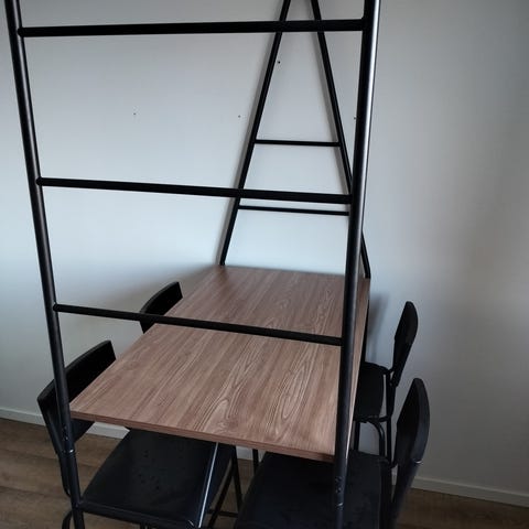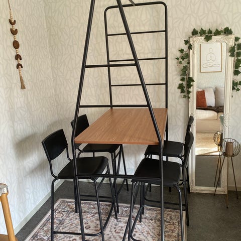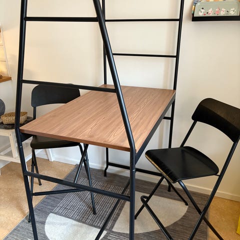 Bord inklusive 2 barstolar och 3 förvaringskorgar.