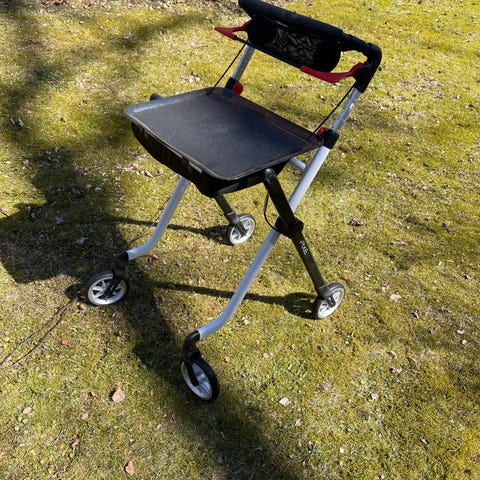 Röd rullator med fyra hjul, sits och underliggande korghylla. Utrustad med handbromsar på båda handtagen. Lätt att fälla ihop.