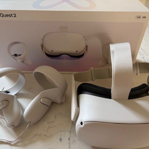 Säljer mitt oculus quest 2 med 256gb för att jag tänkte uppgradera. Den har en liten spricka i bågen som sitter runt ögonen men det påverkar inte funktionen (se bild).