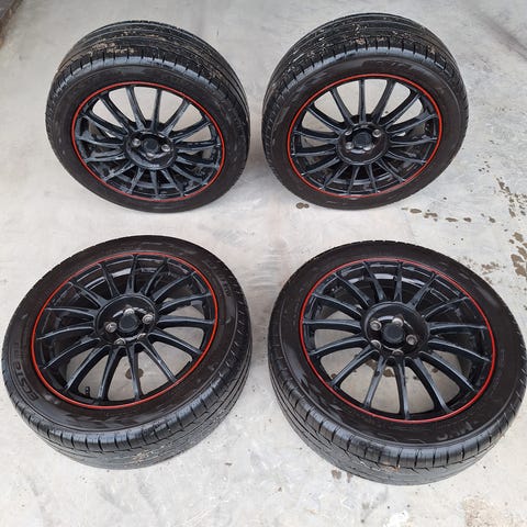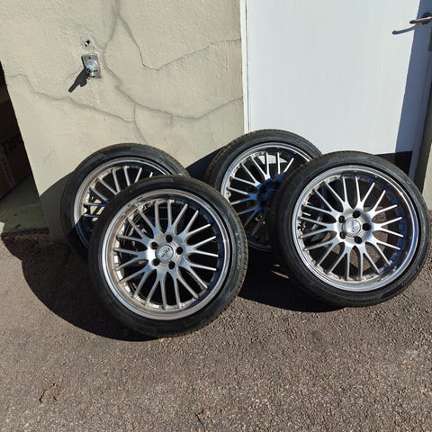 BBS Challenge fälgar. 18t tum.S varta med röd fälgkant. Sitter på slitna sommardäck. Lite kantskrap finns, se bilder.